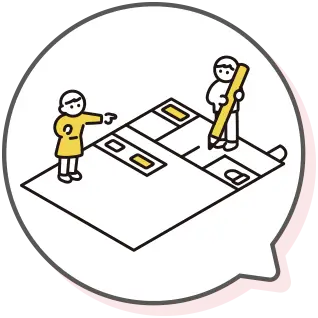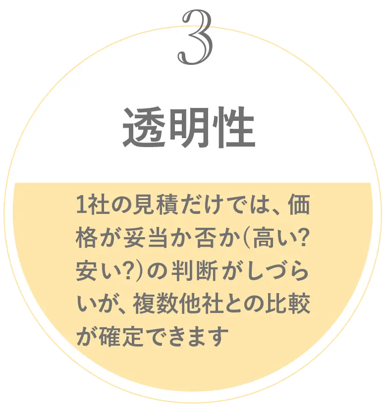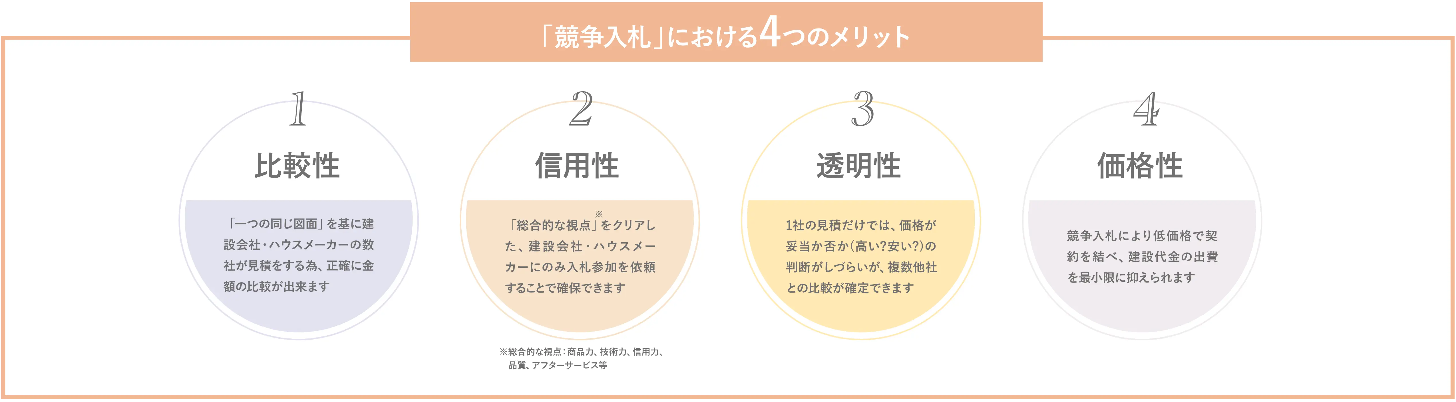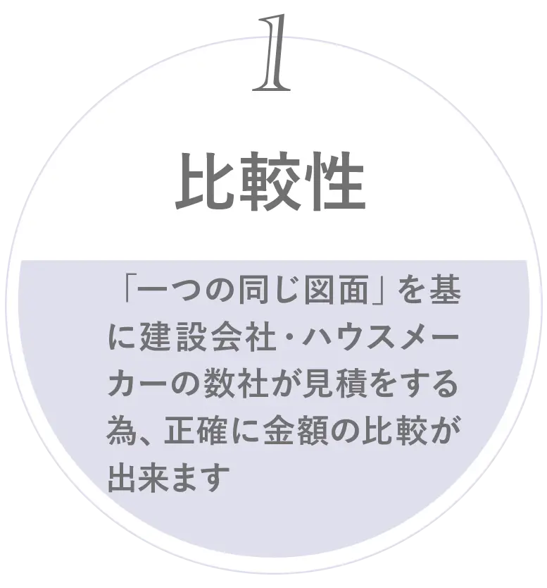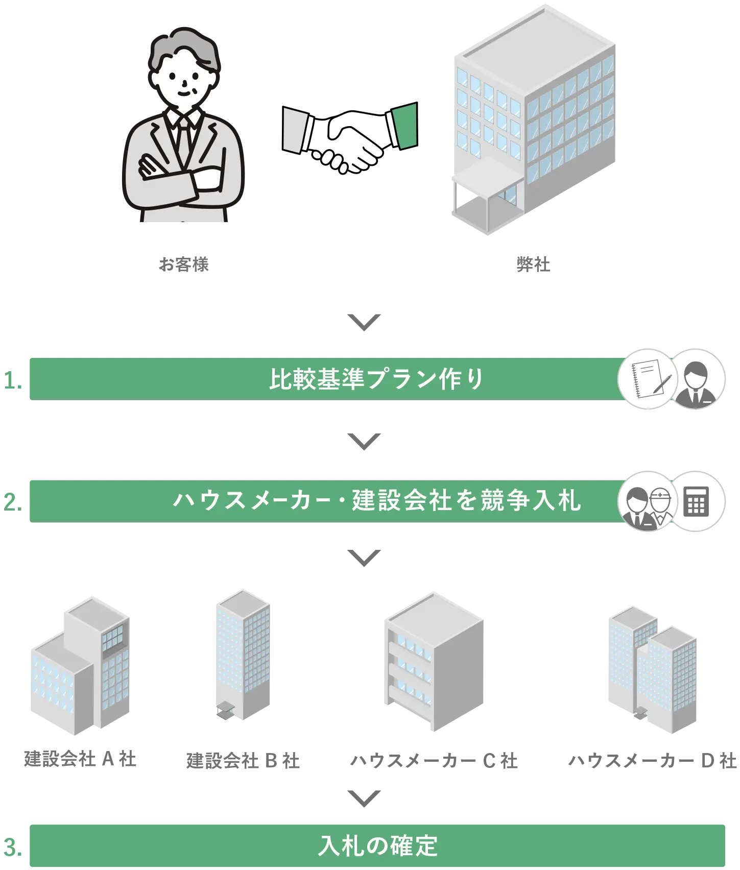 お客様の「目的・要望・思い」を基に、“基準となる、ひとつの同じ図面”を作成し、それを基に、工事会社数社に競争入札をすることで、工事会社及びコストの比較検討が可能となり、お客様の意図を反映しつつ、経済的合理性に基づいた発注先を選定できます。