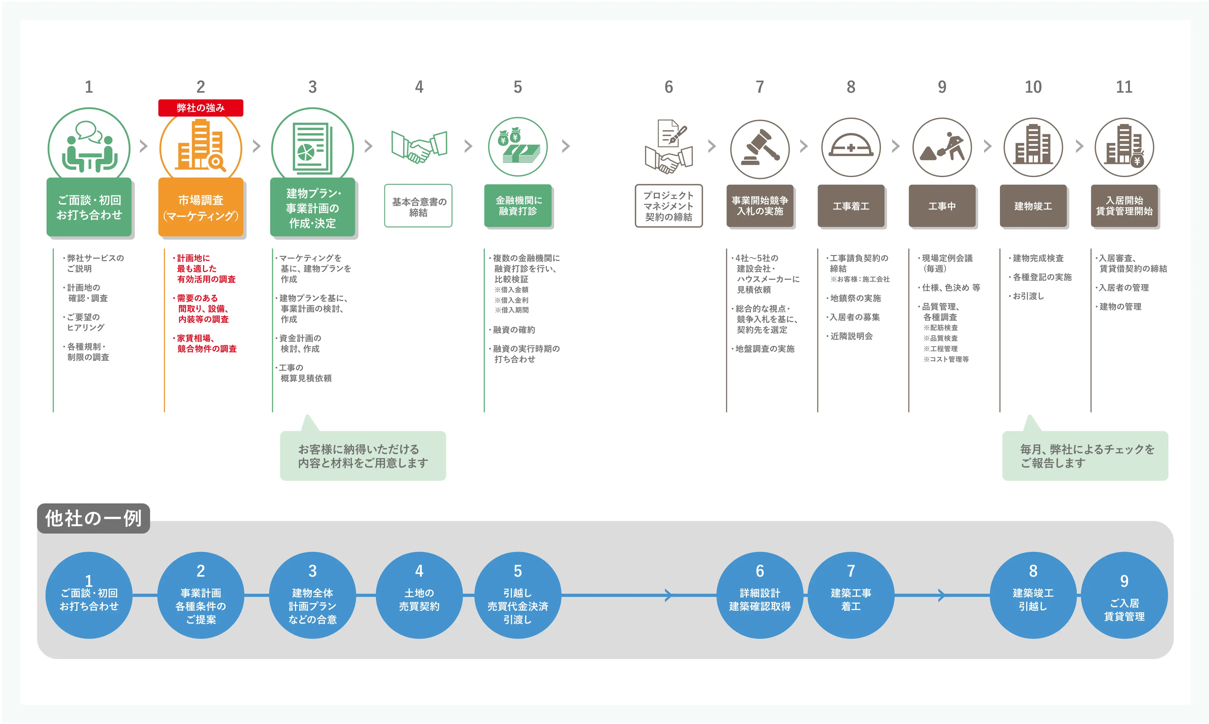 お客様の代理となる「プロジェクトマネージャー」が、プロジェクト全体の統括を担うことにより、賃貸需給マーケット・建設コスト・品質、建物管理等における第三者による調査・査定・チェックが可能となります。