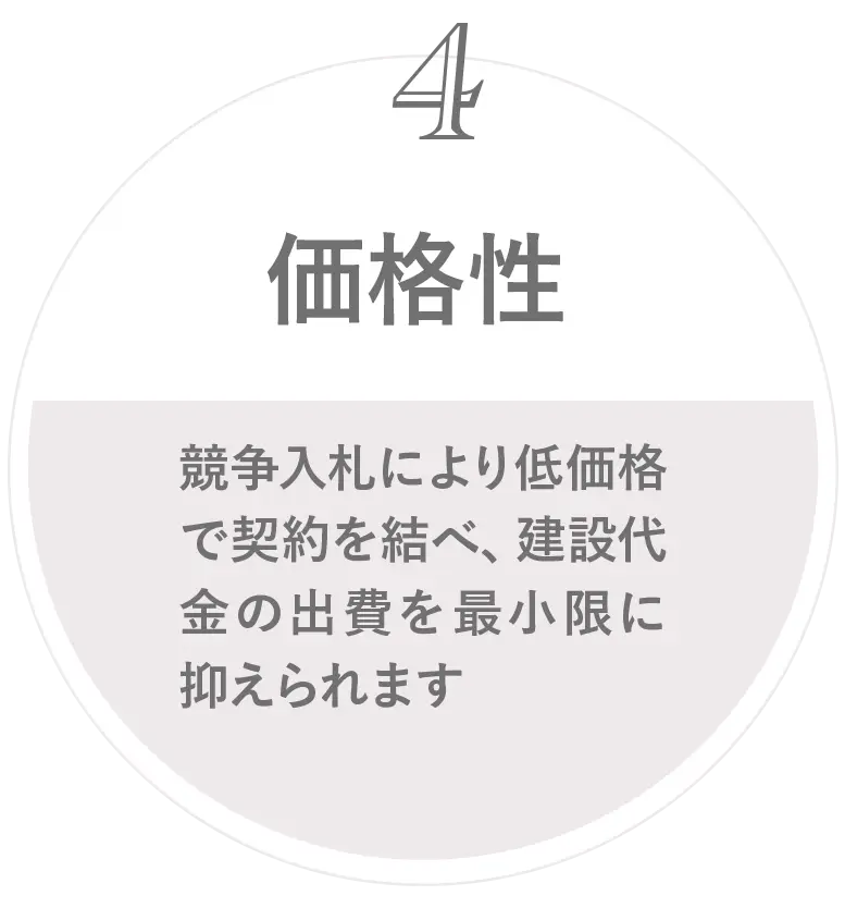 その建設代金のお支払い先である、建設会社・ハウスメーカーのご提案にも優れたものが多々あるかと存じます。しかし、建設会社・ハウスメーカーは、本来である「建設すること」が目的です。あくまでも「建設すること」はお客様の目的達成の為の手段の一つであり、 「建設代金」と「建設代金」に見合った「商品力、技術力、信用力、品質、アフターサービス」等の総合的な視点で建設会社・ハウスメーカーを比較すべきであると考えています。弊社では、お客様の「土地の有効活用のパートナー」として、建設会社・ハウスメーカーを「競争入札」・「総合的な視点」にて選定し、 「最適な土地の有効活用の総合プロヂュース」をおこないます。